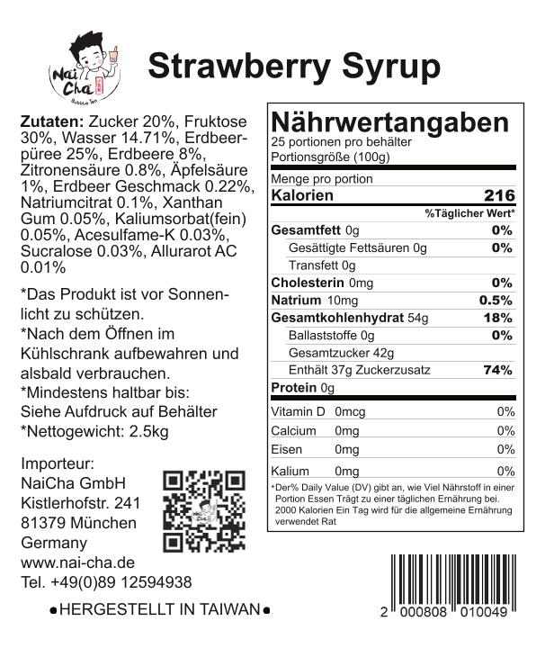 Zucker 20%, Fruktose 30%, Wasser 14.71%, Erdbeer- püree 25%, Erdbeere 8%, Zitronensäure 0.8%, Äpfelsäure 1%, Erdbeer Geschmack 0.22%, Natriumcitrat 0.1%, Xanthan Gum 0.05%, Kaliumsorbat(fein) 0.05%, Acesulfame-K 0.03%, Sucralose 0.03%, Allurarot AC 0.01%